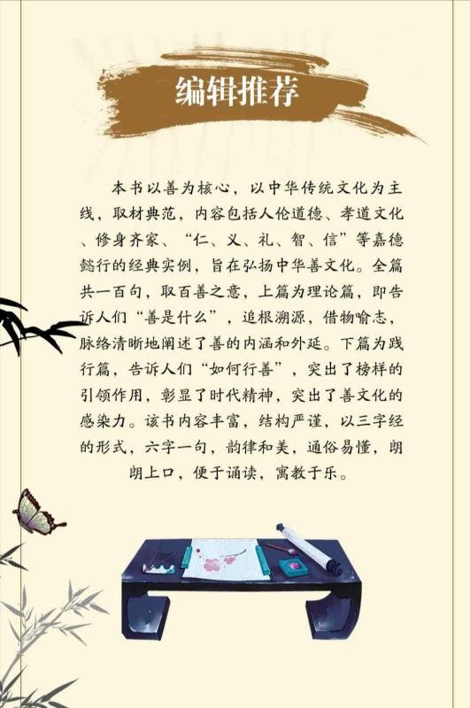 《中华善字经(汉英对照)》以善为核心,以中华传统文化为主线,取材典范,内容包括人伦道德、孝道文化、修身齐家、“仁、义、礼、智、信”等嘉德懿行的经典实例,旨在弘扬中华善文化。