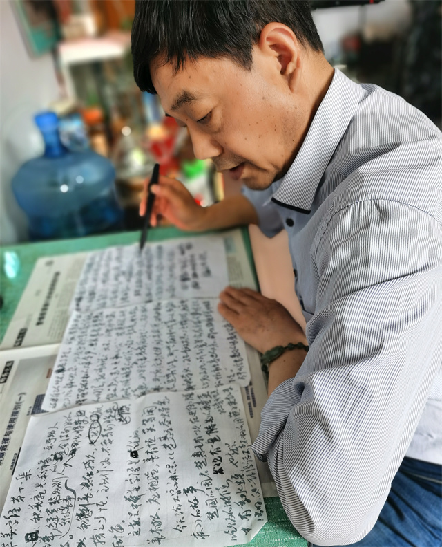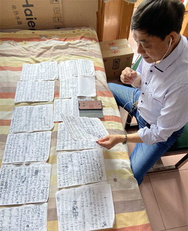 为了能让每一个故事内容丰满,有血有肉,情节跌宕,引人入胜,听众喜欢,在编写每一集评书过的程中,他都会根据《中华善字经》里的经典故事,结合故事里的内容情节场景和评书的特点,展开丰富想的象力,编写故事讲稿,边写边说,尽量口语化,通俗话。一集评书讲稿修改要三四遍才成型。在录制过程中,为了达到声情并茂,往往是全神贯注,手舞足蹈,完全融入其中。每一集都要录上好几遍,有时候甚至要录上十来遍。从录制到结束,力求做到一气呵成,录一集下来一身汗。每一集都是用毛笔写在纸上,反复修改,用毛笔抄的草稿纸摞起来有四米高了。